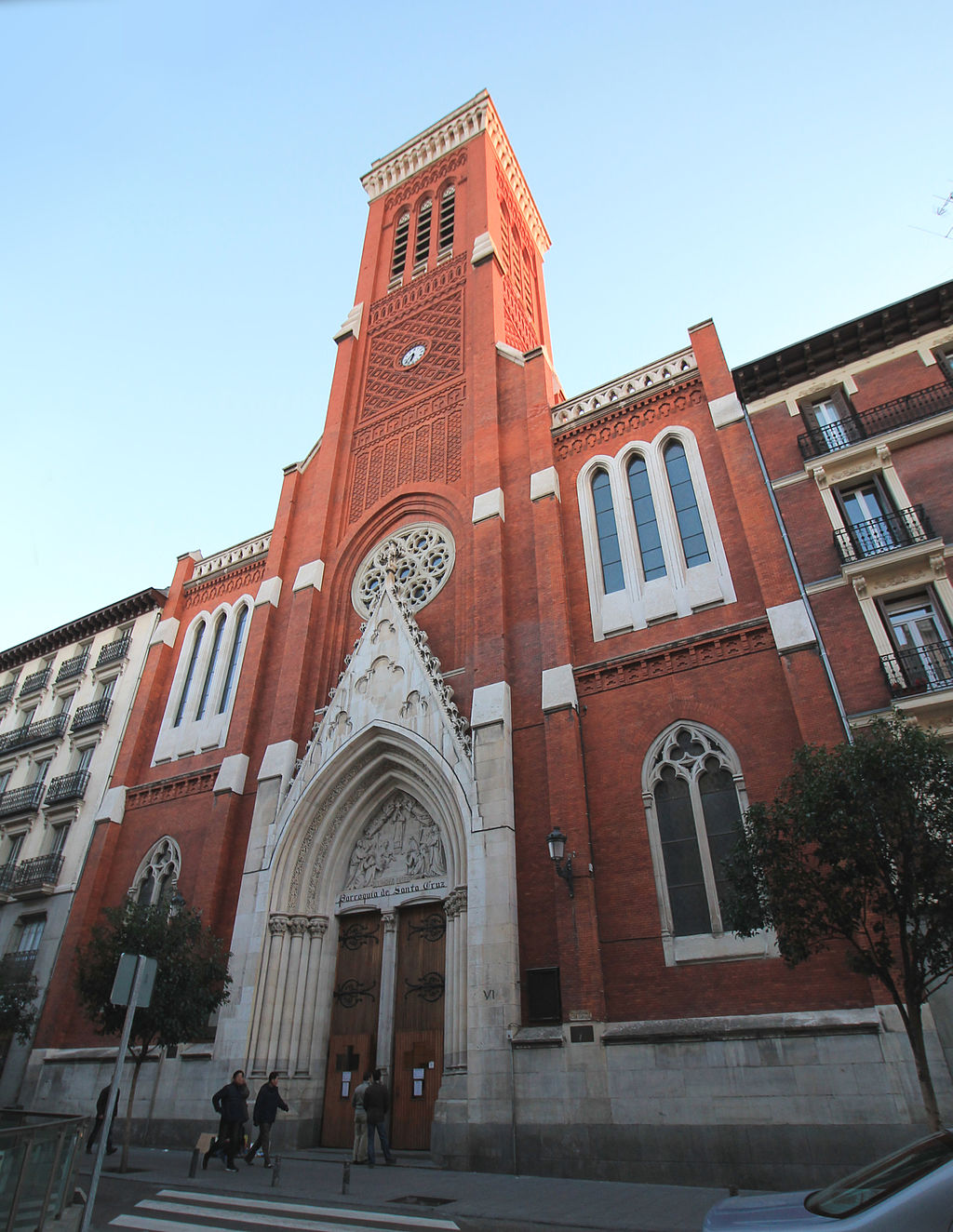 The Church of Santa Cruz, located in the historic center of Madrid on Calle de Atocha, is a masterpiece of neo-Gothic and neo-Mudéjar architecture. This place of worship has a rich and fascinating history, dating back to the 16th century, when the Convent of Santo Tomás de Aquino was founded by the Dominicans. The original construction of the current building began in 1626 under the patronage of the count-duke of Olivares, but over the centuries it has undergone numerous fires and reconstructions. The current structure, designed by architect Francisco de Cubas, began to take shape in 1889 and was completed in 1902, thanks to a public funding campaign. The red brick and white Colmenar stone facade is a typical example of neo-Gothic style, with a large pointed arch and a triangular pediment topped by a cross. A notable detail is the relief by Aniceto Marinas depicting the Apotheosis of the Cross, located above the main entrance. One of the most impressive features of the church is its tower over eighty meters high, which recalls the tradition of the tower of the ancient parish, known as the “Atalaya de la Corte” for its height and visibility. This tower, with a cantilever and a bell level parapet, was for a long time one of the tallest structures in Madrid until the construction of the Telefónica Building in the 1920s. Inside, the church features a single nave with eight side chapels, each dedicated to different devotions. Among these, the statue of Saint Jude Thaddeus stands out, known as the patron saint of impossible causes, attracting hundreds of devotees every Wednesday, making it one of the most venerated images in Madrid after the Cristo de Medinaceli. Another significant work is the painting of the Virgen de la Cinta, patroness of Huelva, venerated by a subsidiary brotherhood of the Andalusian city. The church also houses the Archicofradía del Santo Entierro, one of the oldest brotherhoods in Madrid, founded in 1412. This brotherhood organizes solemn processions during Holy Week, especially on Good Friday, carrying the images of the Santo Entierro and the Virgen de los Siete Dolores through the city streets. The history of the church is marked by dramatic events, such as the great fire of 1876 that completely destroyed the previous building. The construction of the new temple was a symbol of rebirth for the community, which contributed with donations to complete the work. The church has undergone various restorations, the latest of which has preserved the original decorations and improved the structure to adapt it to modern needs. The central location of the church, just steps away from Plaza Mayor and the Las Letras neighborhood, makes it easily accessible and an ideal starting point for exploring the historic center of Madrid. Its architectural beauty and historical importance make it a must-visit for anyone visiting the Spanish capital.